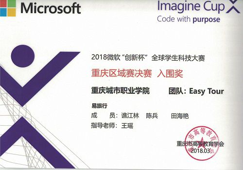 从重庆市高等教育学会《2018微软“创新杯”全球学生科技大赛首届重庆区域赛决赛入围通知》获悉,学院创新创业项目“易旅行”入围2018微软"创新杯"全球学生科技大赛首届重庆区域赛决赛,重庆共有两所高职院校入围决赛。