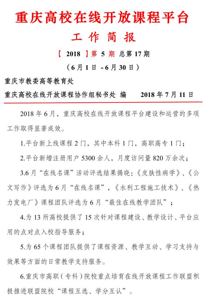 日前,从《重庆高校在线开放课程平台工作简报》(2018年第5期)获悉,学院在线开放课程《公文写作》被评为重庆高校在线开放课程平台6月“在线名课”。