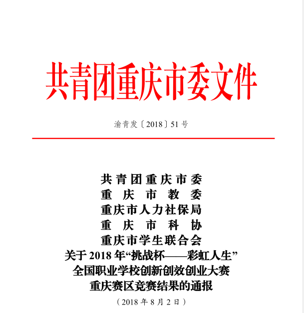 近日,由团市委、市教委、市人力社保局、市科协、市学联共同主办的2018年“挑战杯——彩虹人生”全国职业学校创新创效创业大赛重庆赛区比赛落下帷幕。学院信息工程系胡冰瑶老师指导的陈兵、游经义同学的项目“骑行灯控系统”荣获银奖。 本次比赛自2018年5月启动以来,全市共有21所学校推荐125件作品参加比赛。最终共评选出高职组金奖20名,银奖26名,铜奖34名。 该项目在此次比赛中获奖,将进一步推进学院创新创业教育,助力学生素质提升与全面发展。