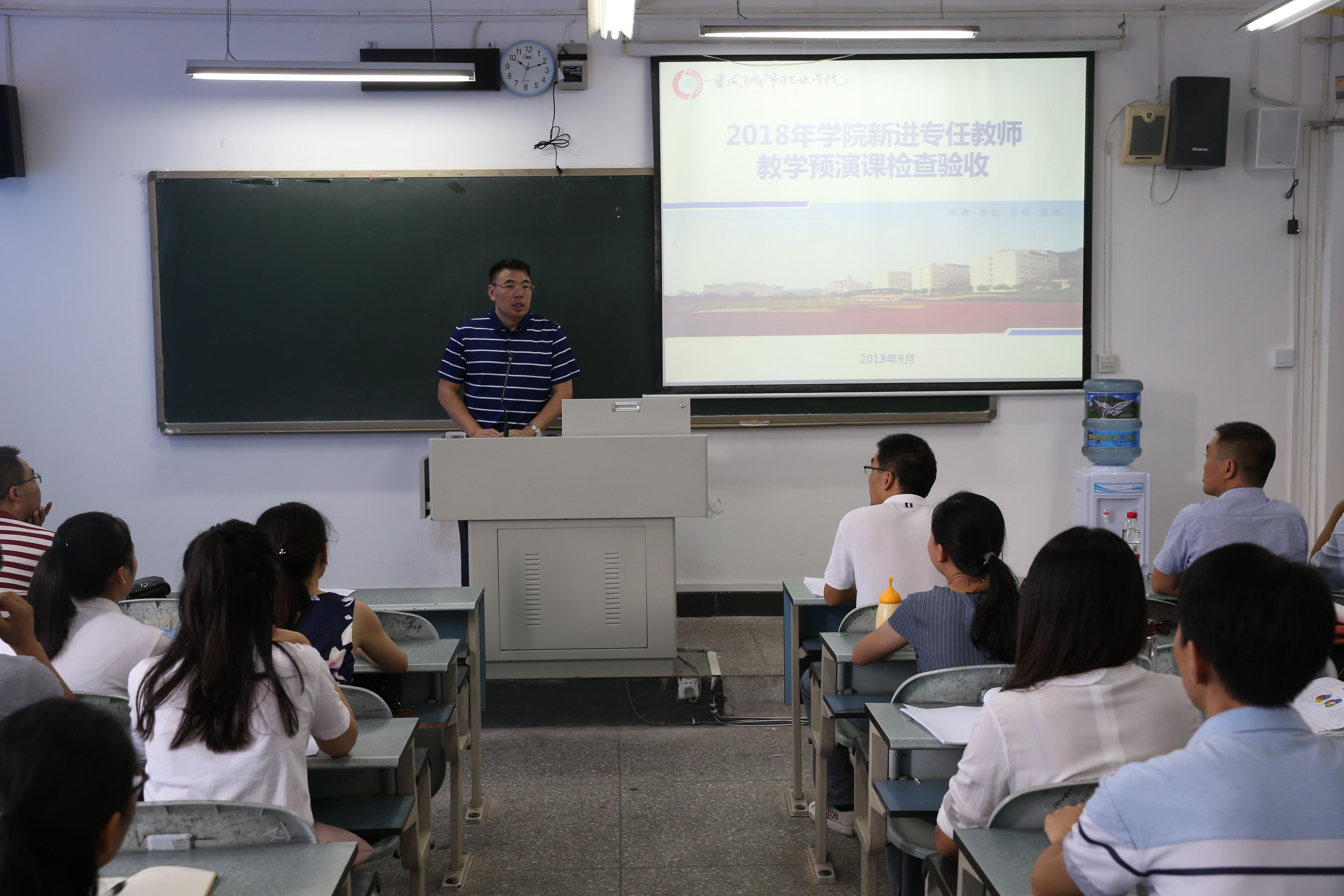 为帮助新进专任教师更快更好地进入角色,具备“站上讲台”、“站稳讲台”、“站好讲台”的基本素质,顺利承担新学期的教学任务。9月3日上午,学院在文华楼103、105、109、110教室对2018年新进的18名新教师进行“教学预演课”检查验收。学院副院长文斌、刘仲全,科研与规划发展中心汪涛博士,教学工作委员会全体成员担任评委。