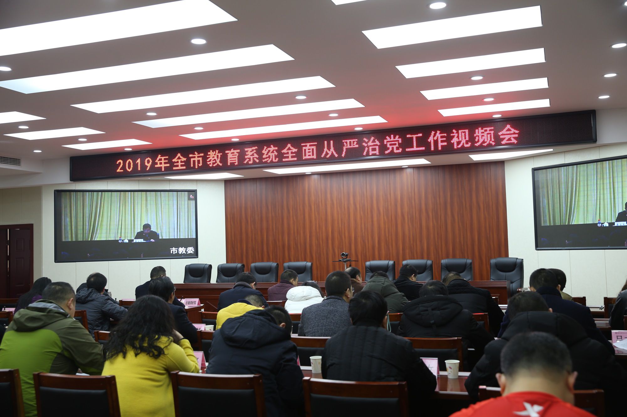 3月8日上午9时,重庆市委教育工委组织召开2019年全市教育系统全面从严治党工作视频会议,学校在博学馆510会议室设立分会场,全体校领导和科级及以上干部,各院系专职组织员,党支部书记、支部纪检委员参加会议。