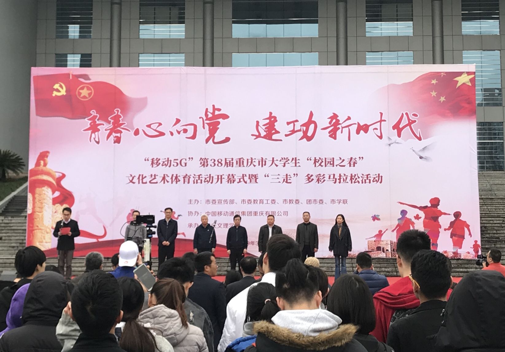 3月23日上午,由市委宣传部、市委教育工委、市教委、团市委、市学联联合举办的“移动5G”第38届重庆市大学生“校园之春”文化艺术体育活动开幕式暨“三走”多彩马拉松活动在重庆文理学院举行。学院师生代表队与来自全市各高校的1000余名师生代表一同参加了开幕式以及“三走”主题多彩马拉松活动。