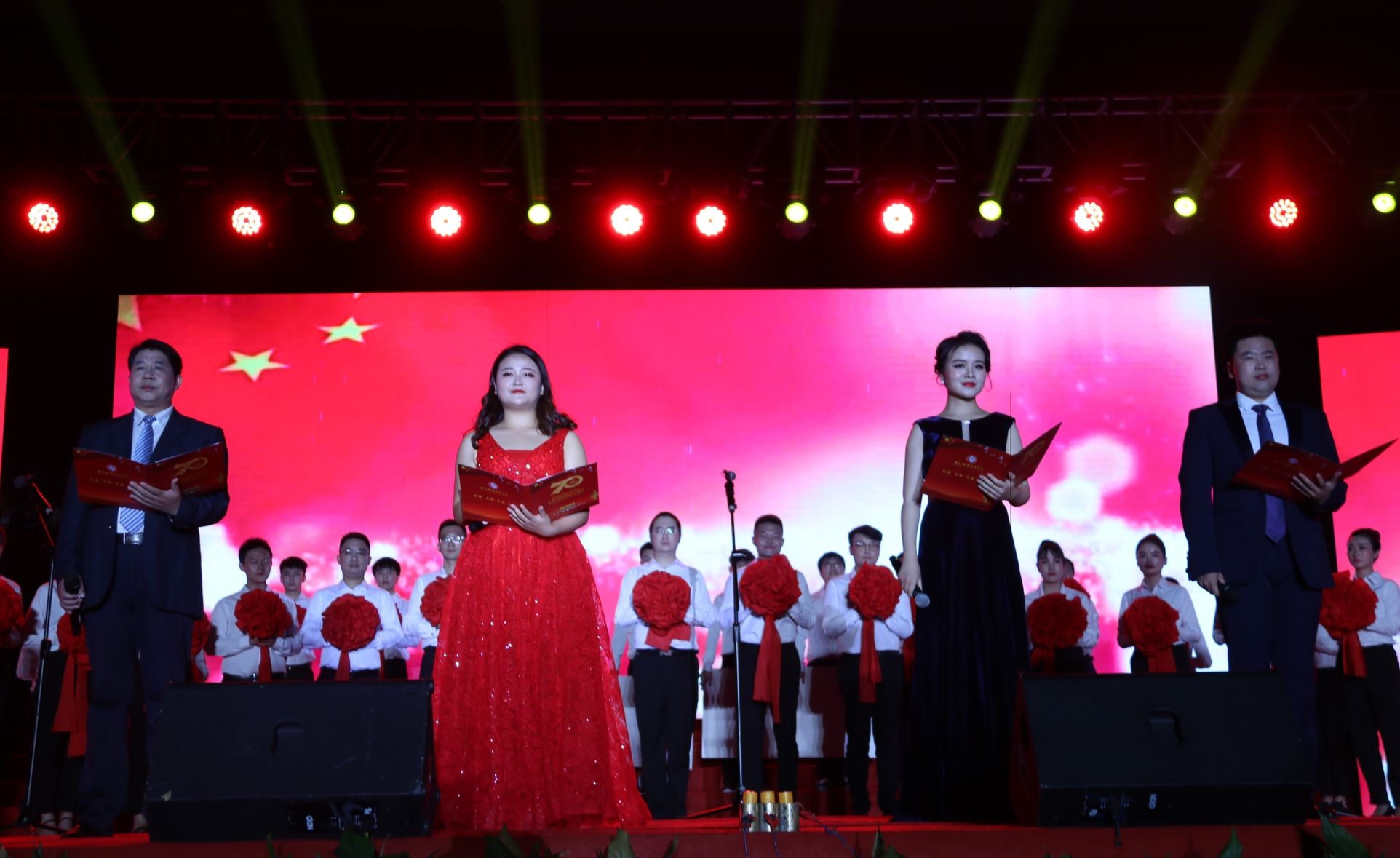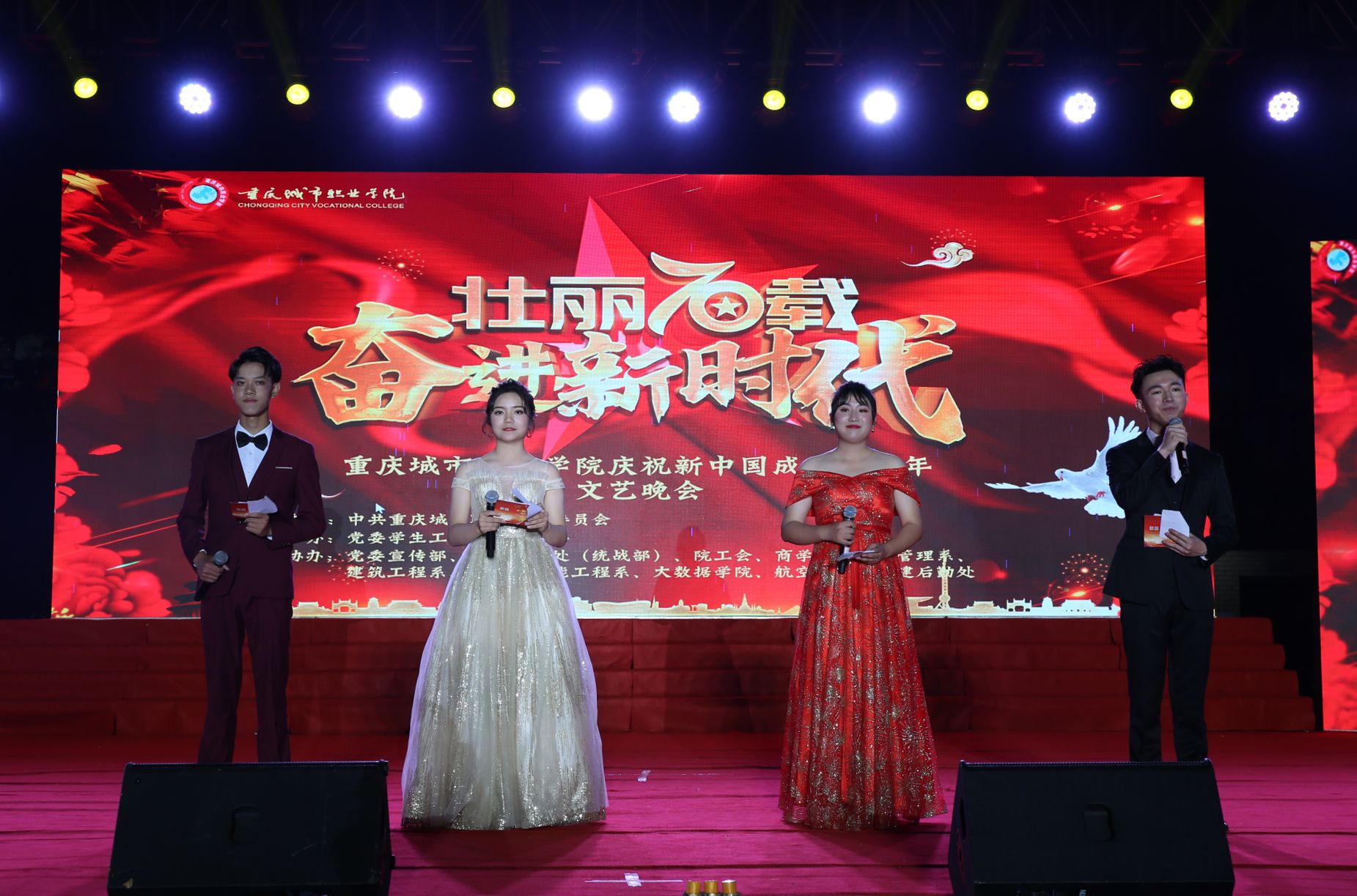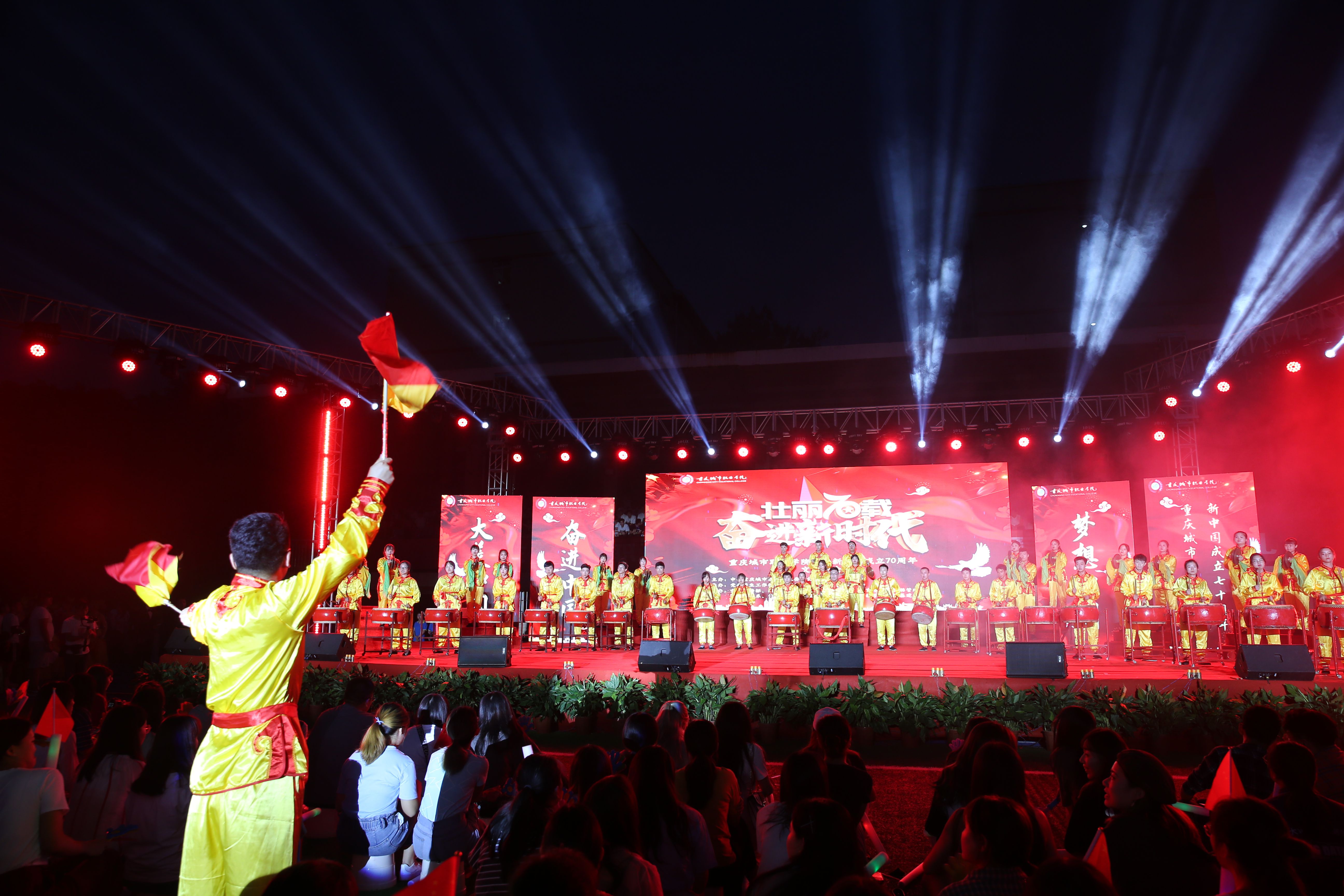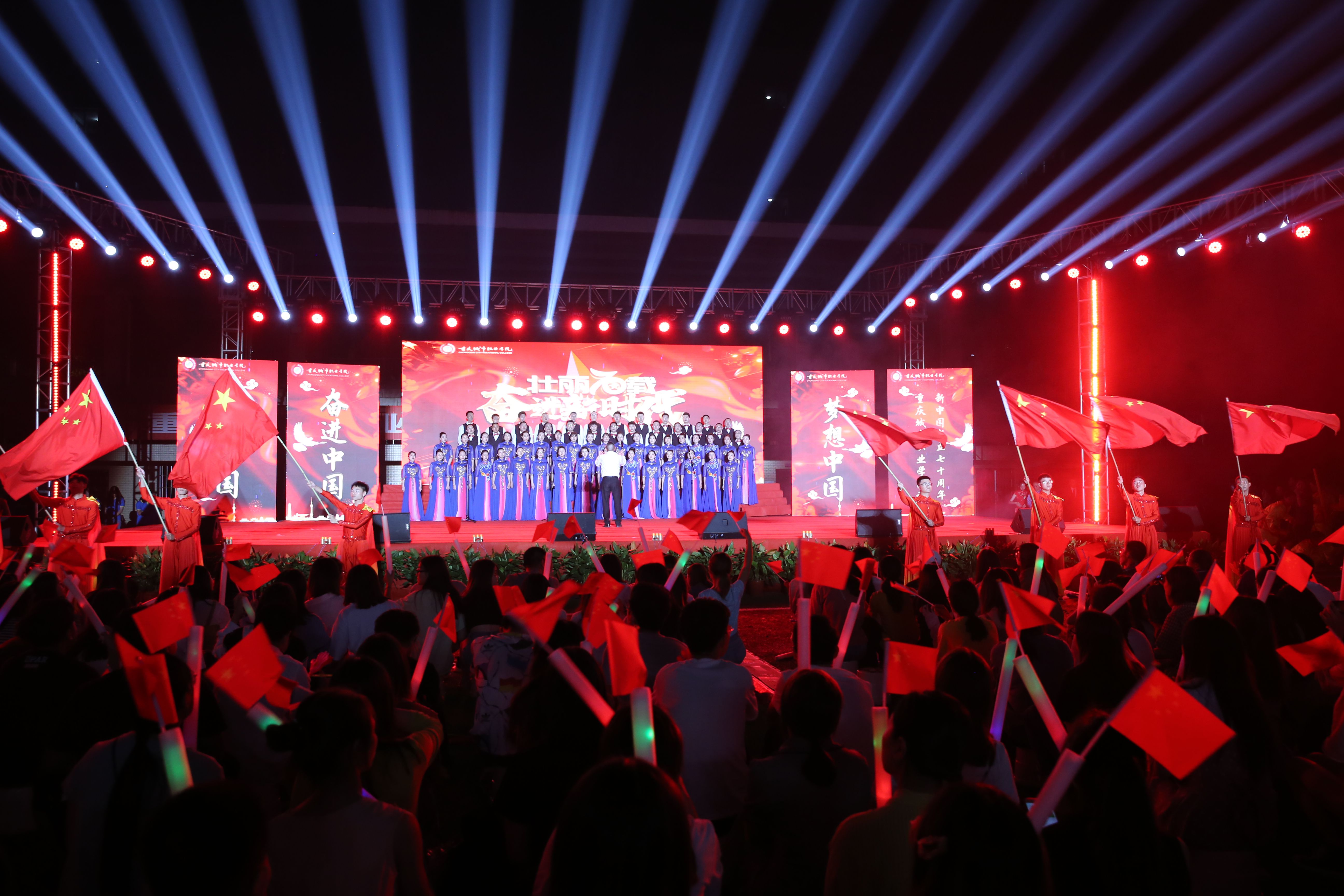 在田径场隆重举行“壮丽70年,奋进新时代”庆祝新中国成立70周年文艺晚会。全院师生挥舞红旗,载歌载舞,以丰富多彩的爱国题材节目,共贺新中国70华诞,共同唱响对祖国母亲的热爱之情。团市委高校工作部部长潘毅、永川团区委副书记李娴雅、中国电信永川分公司总经理周勇、中国电信永川分公司副总经理龙浩、中国移动永川分公司副总经理刘闻斌,校企合作单位的嘉宾和学院领导及在校师生共同观看演出。
