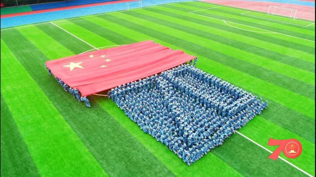 在张燕老师的指挥下,正在军训的2019级新生组成了1949-2019、70等字样,一面长达30米的国旗被同学们高举的双手传递,从700人的头顶拂过。这庄严的时刻,令现场每一个人都感到无比骄傲和自豪,爱国深情溢于言表。