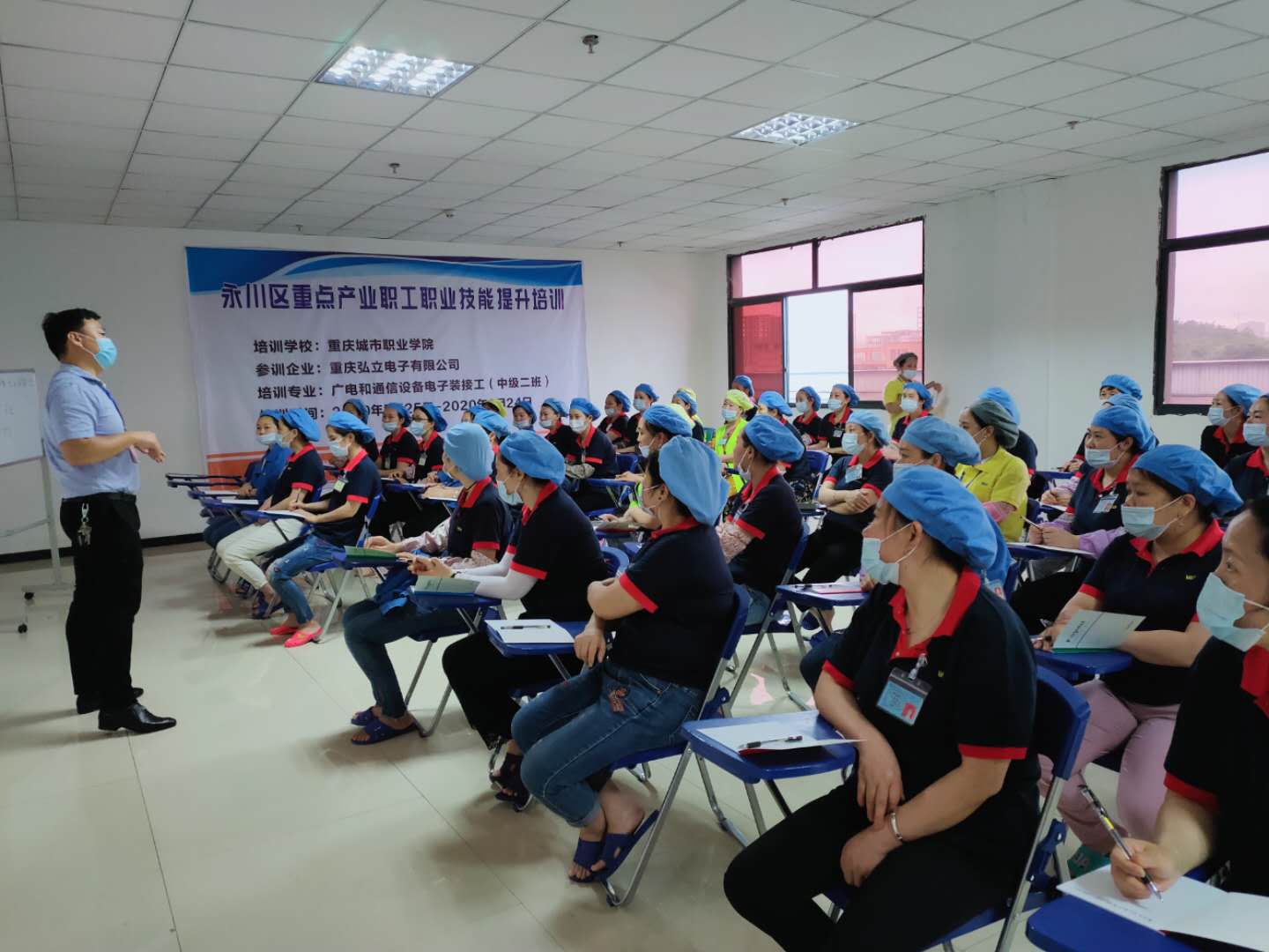 在重庆弘立电子有限公司开设的永川区重点产业职工职业技能提升培训班正式开班。本次培训工种为广电和通信设备电子装接工(中级),培训人数150人,培训时长1个月。