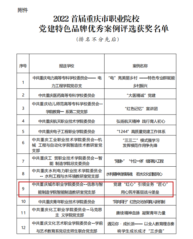 信息与智能制造学院智能制造教研室党支部工作案例《党建“红心”引领业务“匠心” 用心筑牢基层战斗堡垒》入选2022首届重庆市职业院校党建特色品牌优秀案例。