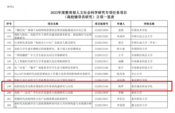 近日,教育部社科司公布了2023年度教育部人文社会科学研究专项任务项目(高校辅导员研究)评审立项结果,无码影片 商学院教师杨翠主持的《高职院校劳动教育增值性评价体系构建研究与应用》获批立项,实现无码影片 教育部高校辅导员研究专项任务项目零的突破。