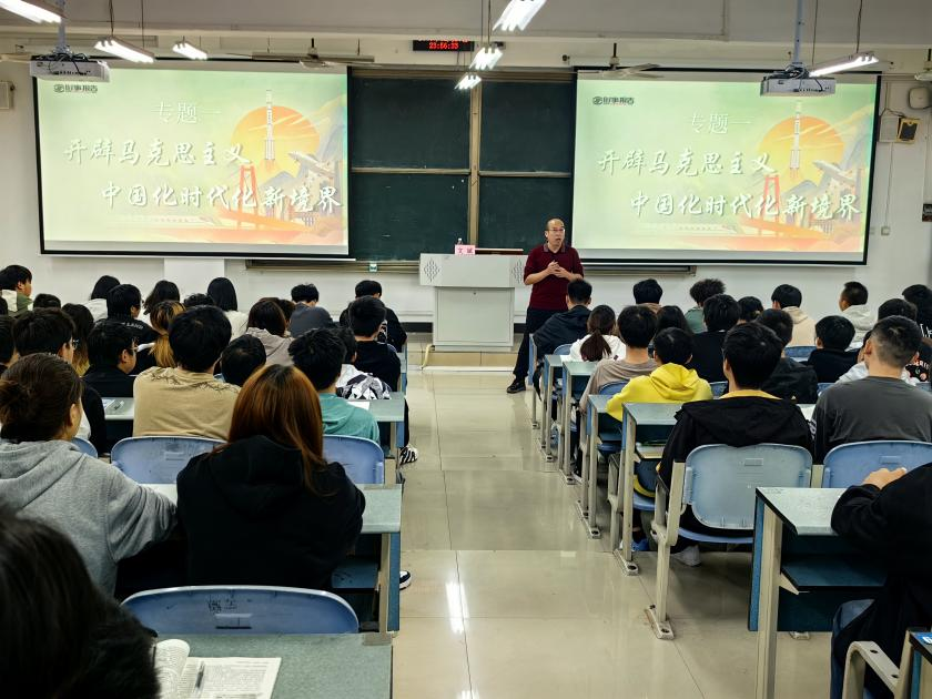 校党委委员、副校长文斌以“开辟马克思主义中国化时代化新境界”为题讲授“形势与政策”课